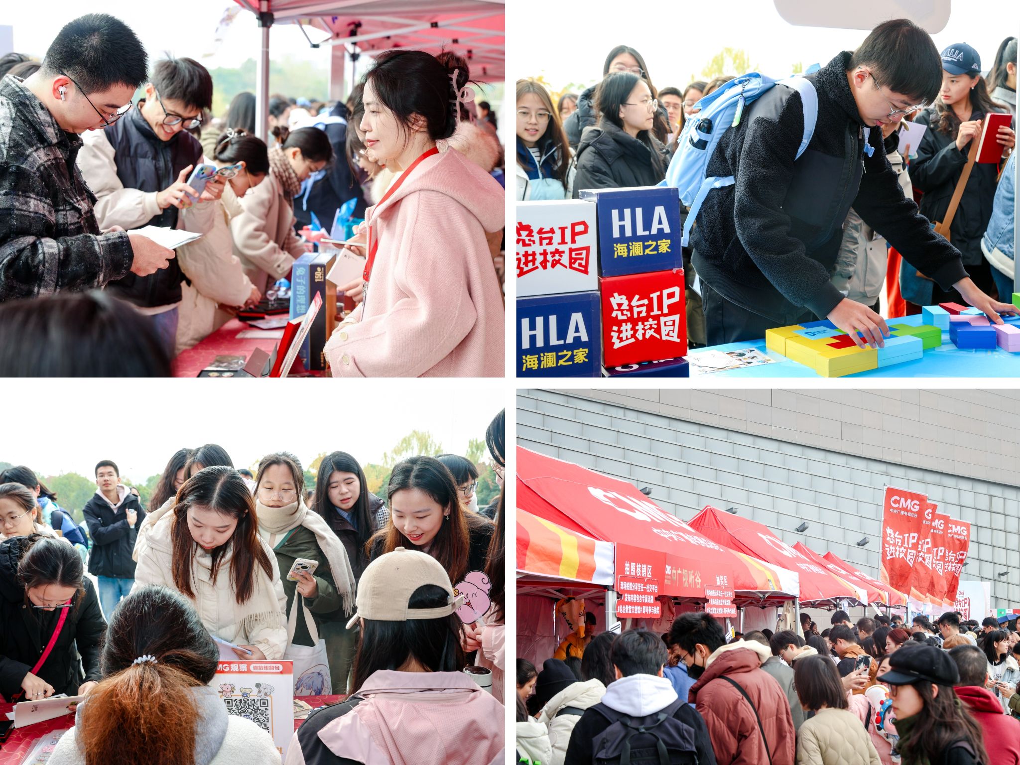 在520广场,“总台IP市集”一排排琳琅满目的摊位吸引了众多师生驻足流连。在《中国诗词大会》展台,“小诗人”们络绎不绝,成功背诵古诗即可获得精美贴纸;大朋友、小朋友们与CMG观察的吉祥物小象“采采”“鼓鼓”亲密互动,欢声笑语不断;蛇年春节联欢晚会联名围巾等各类文创精品展现了创意的力量。