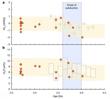 图3 始太古代(40 – 36亿年)花岗质岩浆氧逸度和水含量的升高指示俯冲启动,红色为太古宙花岗质岩石数据,白色方框为澳大利亚Jack Hills碎屑锆石数据