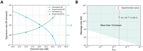 该量子电子商务协议可以容忍量子密钥的部分隐私泄露,因此在后处理阶段不需要进行复杂的隐私提纯操作,在大规模网络和大数据传输的情景下可以节省可观的计算资源、网络带宽和数据处理时间。该方案成功在25 dB(约150千米光纤衰减)的传输损耗下对大小为0.428 Mb的交易文件实现每秒0.82次的处理速率,如图3(A)所示。相较之前量子数字支付方案[Nat. Commun. 14, 3849 (2023)],处理速度与传输距离均有了极大提升。此外,该方案在处理大文件时具有出色的性能,随着签名长度的增加,在相同的失败概率下,签名文件的大小呈指数级增长,在20 dB的传输衰减下对千兆大小的文件处理速度超过10次每秒,如图3(B)所示,为实现城域范围内的实时交易带来希望。同时,研究团队还证明了该方案对于设备不完美的鲁棒性,实验中通过量化量子态的制备缺陷、量子态的传输偏差,对包括光强波动、码型效应、偏振偏差、相位差异和特洛伊木马攻击等所造成的信息泄露量精确估计,而给出了协议失败的最大概率。此外,该研究工作中建立的网络结构不需要事先指定可信第三方进行支付验证,因而不需要固定中心节点。未来,通过利用当前先进的量子密钥分发所使用的量子通信技术,可以进一步提升量子电子商务协议中量子态调制速率、制备精度和传输稳定度,使其在城域范围内保障的交易文件处理速率将得到多个数量级的提升。