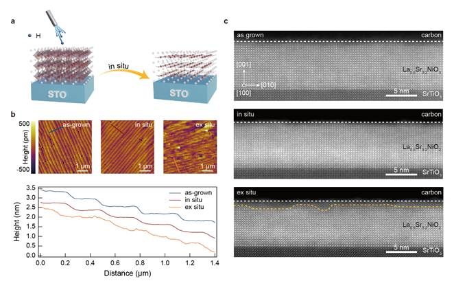 图1 (a) 无限层镍氧化物薄膜的原位制备示意图;(b-c) La0.8Sr0.2NiO2薄膜表面形貌及截面样透射电镜表征,显示原位还原样品具有原子级平整洁净的表面。