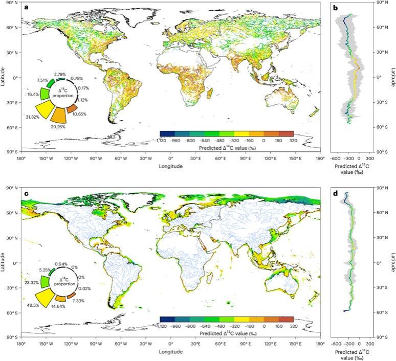 图- 2 河流颗粒物(a、b)和海洋沉积物(c、d) Δ14C预测值的全球分布(a、c)和纬向分布(b、d)。