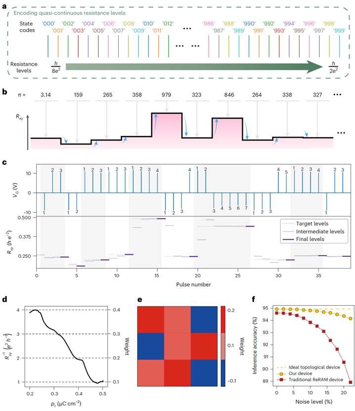 最后,通过利用铁电陈绝缘体的拓扑边界态作为信息载体,研究团队提出了噪声免疫的类脑计算方案。研究团队首先展示了铁电陈绝缘体器件可重复、确定性地访问任意准连续电阻态的能力。为演示该功能,研究团队使用从‘000’到‘999’的三位数对1000个不同的铁电态进行编号(图5a),并使用十进制π的每三位数字组成一个三位数。接着将得到的十个三位数作为编号来选取目标铁电态,最终展示了目标铁电态的任意访问(图5b-c)。进一步,研究团队采用标准的量化感知(quantization-aware)训练方法成功训练了一个卷积神经网络(convolutional neural network, CNN)。利用CNN的识别率,对比了噪声对ReRAM器件和铁电陈绝缘体器件的影响,其中铁电陈绝缘体器件中不同陈数的陈绝缘态用来表示CNN的权值(图5d-e)。研究结果表明,相比于传统的ReRAM器件,基于铁电陈绝缘体器件的CNN具有对噪声免疫的特性(图5f),这表明拓扑保护的量子边界态在类脑计算中具有巨大应用潜力。