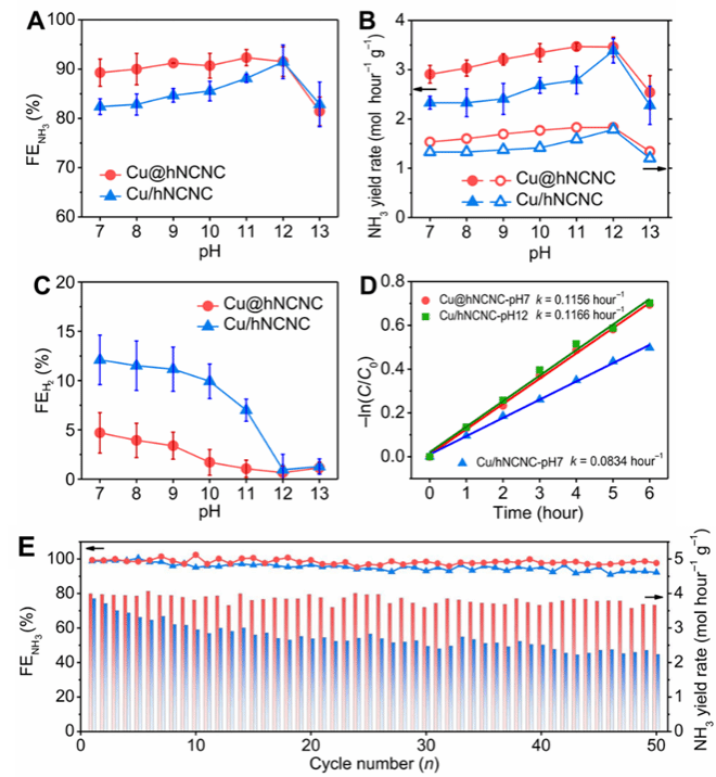 图3. 限域型催化剂和负载型催化剂的产氨性能对比。(A-C)不同pH下的氨法拉第效率(A)、氨产率和分电流密度(B)、氢气法拉第效率(C)。(D)pH 7和12下的一级动力学特征。(E)稳定性。