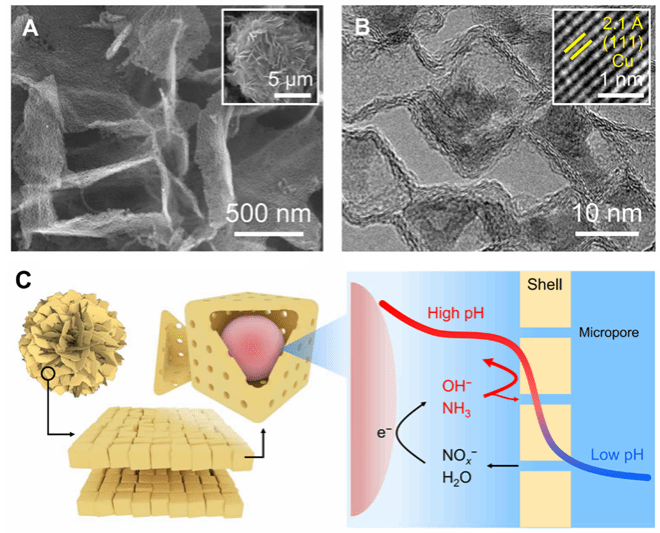 图1. 纳米笼基限域型催化剂形貌及其在反应中自发形成笼内局域高pH环境示意图。