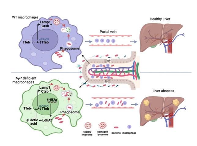 凯发k8官网医学院李宽钰教授课题组和附属鼓楼医院病理科樊智文副研究员合作,利用葡聚糖硫酸钠盐(DSS)造肠炎模型后,意外发现Irp2缺失小鼠有肝脓肿表型。为了探究IRP2在保护机体免受肠源性感染造成肝脓肿中的作用及其机制,研究人员首先给予Irp2全身敲除和髓系细胞Irp2敲除小鼠间隔DSS饮水构建肠道屏障损伤后,发现Irp2缺失后不影响中性粒细胞载菌量变化,只增加巨噬细胞载菌量,同时发现Irp2缺失并不影响巨噬细胞的吞噬功能和溶酶体递送功能,但显著影响溶酶体的生物合成和酸化能力。进一步机制研究发现Irp2缺失上调Hif2a表达,引起乳酸脱氢酶的活性和乳酸水平增加,促进转录因子TFEB的磷酸化,导致TFEB不能正常入核,溶酶体生物合成减少,酸化能力下降,降低了巨噬细胞清除细菌的能力。因此,Irp2缺失后,病原菌有机会从受损的肠屏障进入门静脉,不断侵袭和易位进入肝脏,促进肝脓肿的发生发展。