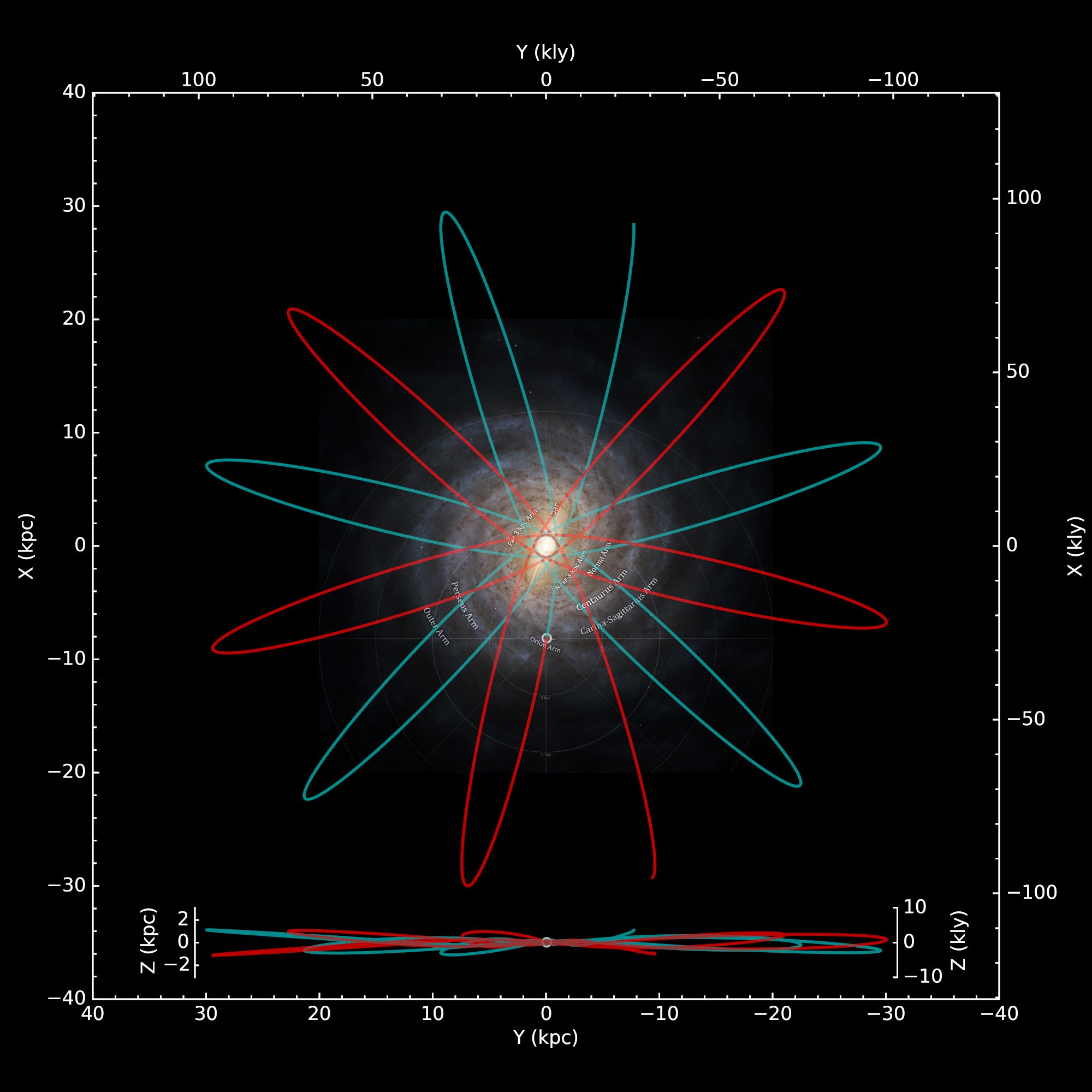 “这对双星的速度非常高,但还不足以逃离银河系。因此,我们能够根据其当前位置、距离、角速度和径向速度来计算其在银河系中的轨道”,该研究论文的合著者、加泰罗尼亚理工大学的 Roberto Raddi 博士说。如图4显示,该双星的银河系轨道沿着银盘且偏心率很大,每4亿年经过距离银河系中心3千光年的轨道(注意我们的太阳距离银河系中心约2.67万光年)。由于该双星的速度如此之高,它在最远点时距离银河系中心10万光年。通过VVV1256-62AB 运动的动画可以更直观的理解其在银河系中的运动(视频如下)。这种偏心轨道的起源尚不明确,但可能与原位内层银晕的存在或银河系与卫星星系过去的合并有关。