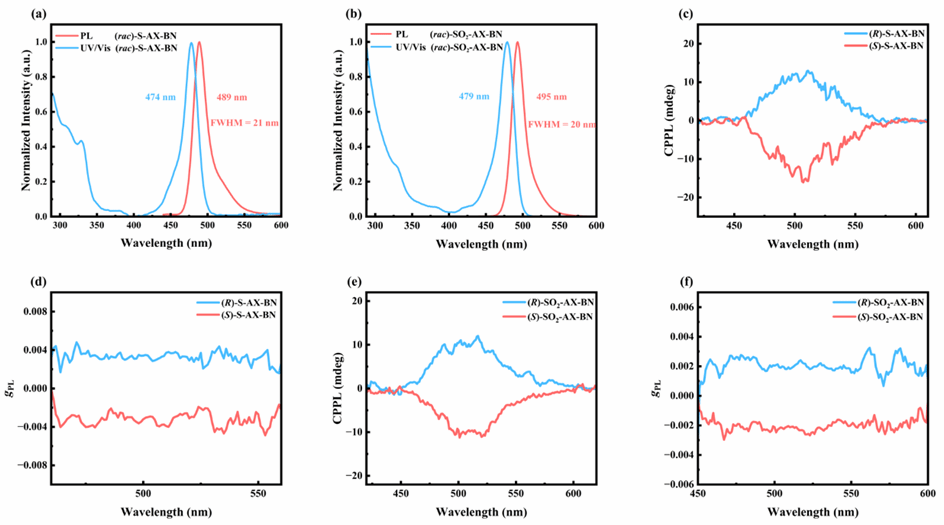 图2. (a), (b) 甲苯溶液中(R/S)-S-AX-BN与(R/S)-SO2-AX-BN的荧光/紫外-可见吸收光谱; (c), (e) 薄膜中(R/S)-S-AX-BN与(R/S)-SO2-AX-BN的CPPL光谱;(d), (f) CPPL光谱对应的gPL-波长曲线。