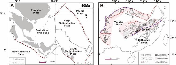 图 1. 两个双向俯冲系统相关的地质记录。(A)40Ma时期的南海区域重建结果;(B)新元古代扬子地块的地质记录。