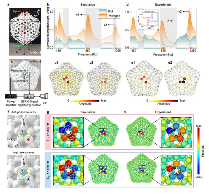 如图1所示,研究团队通过切割和重新拼接二维平面石墨烯,引入多个五边形位错缺陷,形成了三维富勒烯球体结构。结构中的周期性破缺和重新拼接形成了等效规范场。基于规范场理论的计算,预测在拓扑非平庸系统中,局域于五边形处的近零能拓扑保护缺陷态数目为六个。团队利用空气腔体管道结构构建了这一声学等效模型,设计并制造了这种复杂的闭笼状球形声学类富勒烯C540(如图2a所示)。该结构由12个五边形和260个六边形组成。