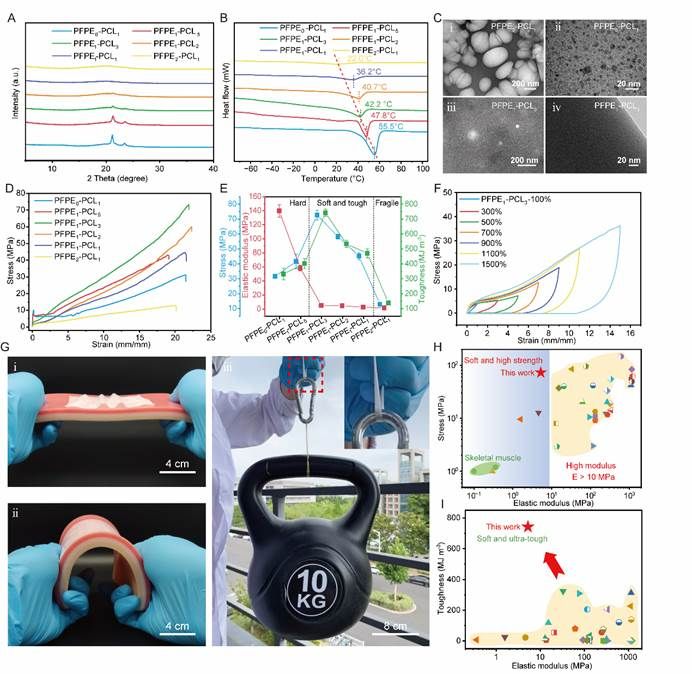 图2. PFPEx-PCLy的力学性能表征与性能比较。