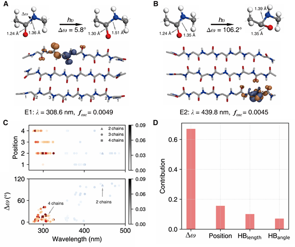 本研究观察到所有自组装体系在约305 nm处均呈现出明显的荧光峰。第一性原理计算揭示了该固有荧光峰的本质,即肽链中部的主链酰胺键在致密的氢键网络保护下受激发,经历电荷转移而产生。这种由自组装导致的主链氢键网络的结构特征显著促进了分子轨道的重叠,为电荷转移过程提供了有利的条件。