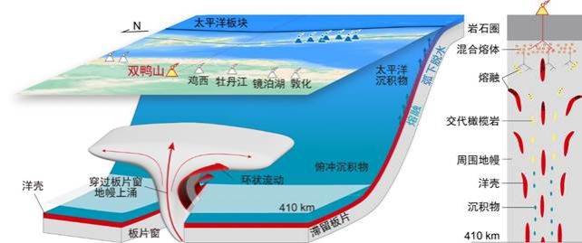 近日,我校地球科学与工程学院和西北大学地质学系组成的合作科研团队,在大陆火山的成因研究上取得了重要进展。该团队采用地球化学与地球物理相结合的方式,分析了东亚大陆火山岩地幔源区的物质组成以及地幔变形特征。研究结果显示俯冲并滞留在地幔过渡带的太平洋板片发生了撕裂,导致地幔发生上涌,板片物质随着地幔上涌返回至上地幔浅部发生减压熔融,进而诱发大陆板内火山作用。