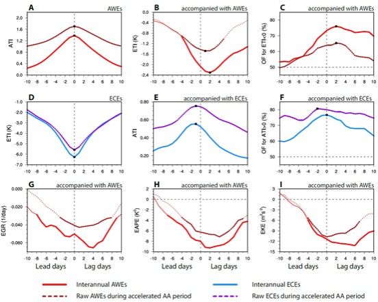 图2 冬季北极暖事件(AWE)和 欧亚冷事件(ECE)之间以及 AWE 与异常天气涡旋活动之间的超前/滞后关系。(A)1981-2022年期间最强的300个年际尺度AWE 北极温度指数(ATI)合成值(实线)和北极加速变暖期间(2002-2022)最强的300个原始AWE北极温度指数(ATI)合成值的超前/滞后曲线;(B)与AWE对应的欧亚温度指数(ETI)合成值;(C)与AWE对应的ETI<0日数的出现频率(OF,%)。(D-F)与(A-C)类似,但为(D)ETI<0的最强300个ECE的ETI合成值;(E)与ECE对应的ATI合成值;(F)与ECE对应的ATI>0 日数的出现频率(OF,%)。(G)与AWE对应的850 hPa最大Eady增长速率(EGR,30°E -120°E and 50°N-60°N);(H)与AWE对应的500 hPa涡旋有效位能(EAPE,30°E-120°E and 50°N-60°N);(I)与AWE对应的300 hPa涡旋动能(EKE,30°E-120°E and 45°N-60°N)合成值的超前/滞后曲线。