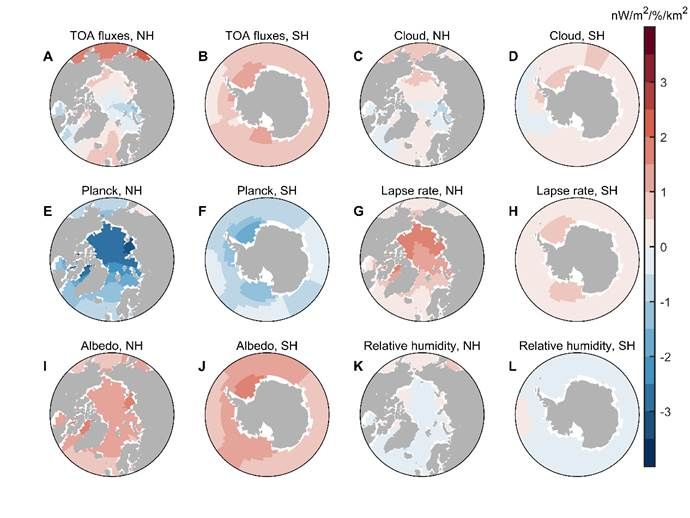 图1. 全球大气层顶能量收支对区域海冰的线性响应函数(A-B),以及云反馈、普朗克反馈(热辐射反馈)、温度直减率反馈、地表反照率反馈和相对湿度反馈的贡献(C-L)。