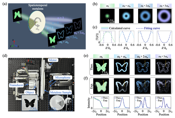 此外,研究团队还将涡旋频率梳应用于时空超透镜的构建,如图4a所示。该超透镜在不同谐波频率下表现出独特的点扩展函数和传递函数分布(见图4b和4c),证明其可作为多模空间微分器。通过图4d所示的实验装置,研究团队验证了该多模声学器件在提取物体完整图像和轮廓边缘信息方面的有效性(见图4e和4f)。这一技术在高容量数据通信、图像信息处理以及动态声场调制等领域具有广阔的应用前景。