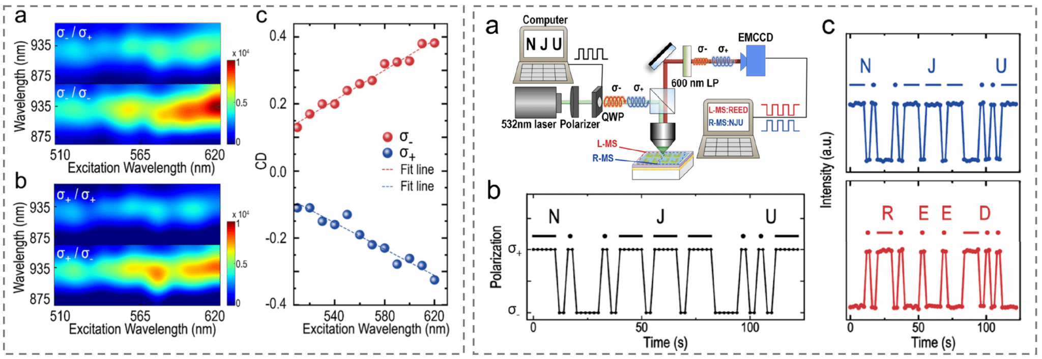 彭茹雯教授和王牧教授研究组长期致力于光与微纳结构相互作用研究。最近,该研究团队创新性地设计并制备出一种双手性超构表面,并将其与单层WS2/WSe2异质结相集成,对异质结中层间激子的谷极化进行了高效调控。他们首先给出利用双手性超构表面增强二维材料异质结中层间激子谷极化的实现方案和物理原理(见图1(上))。该双手性超构表面包含: L-MS为η形金纳米天线阵列,R-MS为其镜像阵列,中间部分为分隔区。由于手性珀塞尔效应,L-MS能够增强σ?偶极子的自发辐射率,而R-MS则能增强σ+偶极子的自发辐射率,从而实现该体系中层间激子谷极化的增强。实验上,他们将单层WS2/WSe2异质结与双手性超构表面相集成,测量结果证实单层WS2/WSe2异质结集成双手性超构表面以后,层间激子的谷极化度显著提高(见图1(下))。进一步地,当激发波长接近620纳米时,在σ?激发光下,异质结中的层间激子的圆二色性从13%增加到38%,在σ+激发光下,WS2/WSe2异质结中的层间激子的圆二色性的绝对值从11%增加到32% (图2(左))。在此基础上,他们将该双手性超构表面与二维材料异质结相集成的器件用于光通信系统,实现了基于谷极化的光信号传输(图2(右))。