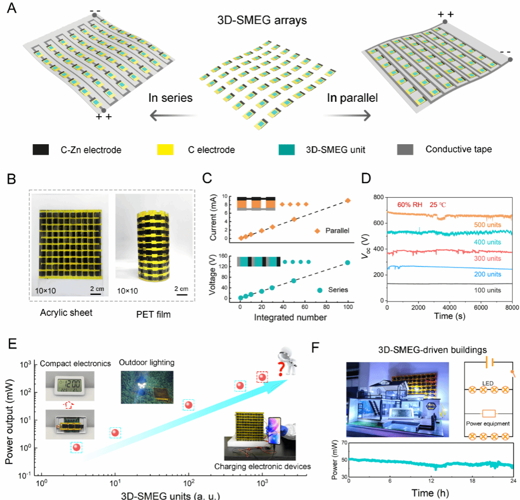 图4. A. 基于3D-SMEG的自供电系统集成示意图;B. 将3D-SMEG组装在薄板和PET柔性膜基体上;C. 不同数量单元串联、并联后的电压和电流输出;D. 单元数量分别为100、200、300、400和500串联集成的稳定电压输出;E. 集成系统驱动商用电器;F. 模拟MEG驱动未来建筑的照片、电路图和相应输出功率。