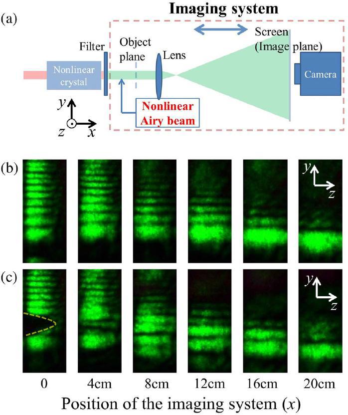 图2. 利用超晶格激发的非线性Airy光束的无衍射、自加速和自愈特性。