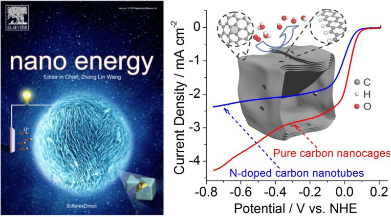 图2. 左图:介观结构碳纳米笼应用于锂硫电池的研究工作被Nano Energy选为封面论文;右图:缺陷丰富的纯碳纳米笼具有优异的氧还原活性。