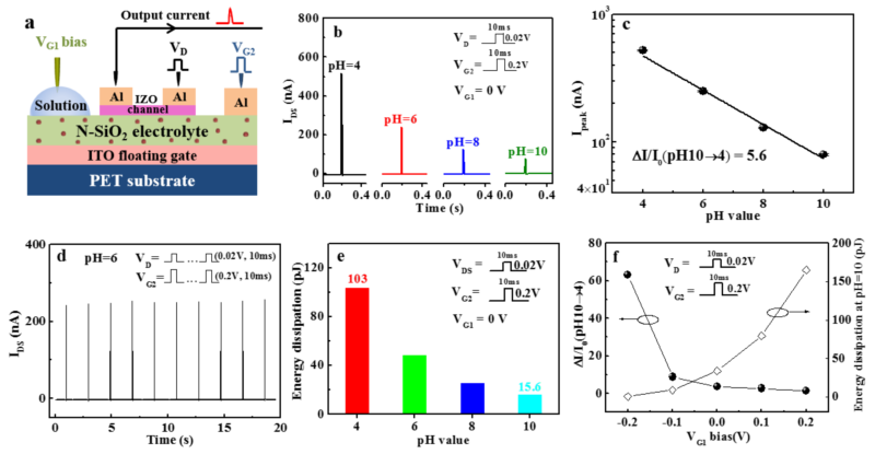 图2. 柔性神经元晶体管的超低功耗spike动态pH值传感特性