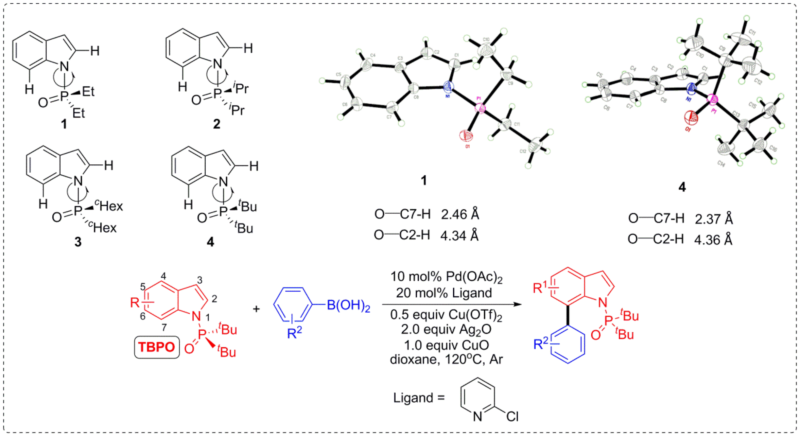 一类N-磷酰基保护地吲哚底物引起我们的关注,通过单晶衍射发现该类底物中,位阻最小的底物1(乙基)和最大的底物4(叔丁基)中,磷酰基上的氧原子均是朝向吲哚7号位上的C—H键。课题组认为这一类底物和过渡金属配位,在一定的条件下应该能实现吲哚7号位的C—H活化反应。推测虽然在固态下,构型有利于7号位的活化,但是在溶液以及高温的情况下,磷酰基上的N-P键可以自由旋转,此时位阻最大的底物4旋转能垒最大,应该是最有可能保持住朝向7号位的构型。