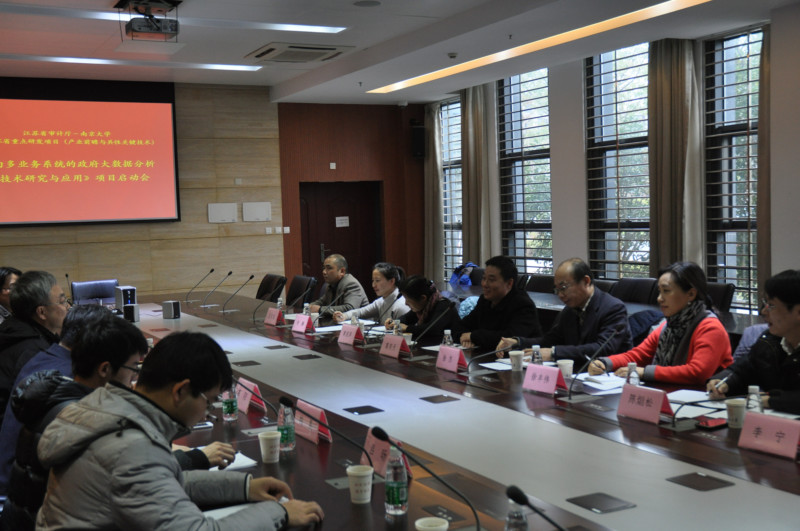 2016年1月20日,项目组在凯发k8官网仙林校区召开了项目启动会。项目组成员汇报了研发计划和预期的研究成果。江苏省审计厅葛笑天副厅长在项目启动会上对项目组寄予厚望,提出“以思路促思维”、“以监督促监测”、“以协作促协调”的工作方针,希望项目组“实现由经验到规律、由个性到共性、由感性认识到理性认识的一系列升华,推出一批有用、管用、好用的理论研究成果,为全面实现更高层次的大数据审计奠定扎实的思想认识基础”。凯发k8官网吕建副校长和审计处陈志云处长出席了会议。