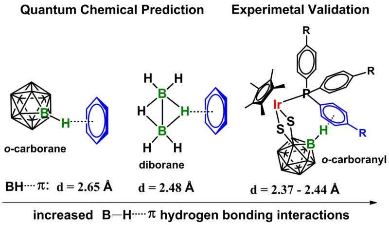 非共价弱相互作用氢键X?H···π ( X = C, N, O ) 广泛存在于分子间及分子内,并在生命活动及分子自组装过程中扮演了重要的角色。上述常见的X?H···π 氢键中X 的电负性大于 H。但是由于硼的正电性,通常情况下B?H化合物与芳环相互排斥而非相互吸引。然而在二硼烷(B2H6)和碳硼烷(C2B10H12)化合物中,三中心二电子(2e-3c)的成键模式使得B?H键的氢原子显示微弱的正电性。B?H键的极性翻转使得在B2H6···C6H6模型和carborane···C6H6模型中B?H···π氢键可在低温条件下存在。