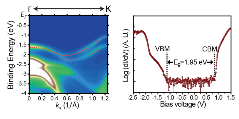左图:单层WSe2的角分辨光电子能谱;右图:单层WSe2的扫描隧道谱