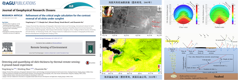 最近,我校国际地球系统科学研究所的陆应诚和占文凤两位副教授,与国际著名海洋遥感专家胡传民教授(美国南佛罗里达大学海洋学院)等研究人员开展合作研究,在海面油膜遥感探测与量化等关键科学问题研究中取得了重要进展。针对美国中等分辨率成像光谱仪(MODIS)影像,完善了近红外波段(中心波长为859纳米)海面油膜归一化耀斑反射率的计算方法,消除了重大误差来源,可用于准确计算海面油膜表面粗糙度和折射率系数。基于油膜的亮温控制与模拟实验,定量厘定了油膜厚度、表面亮温、观测时间、传感器参数(温度等效噪声,NE?T)等要素之间的多维度协同关系,推导并提升了MODIS、Landsat、ASTER等不同星载热红外传感器探测海面油膜厚度的增益系数与效能。上述研究成果有效地促进了墨西哥湾海域天然油膜(来源于海底油气烃渗漏)与深海油井溢油污染(2010年英国石油公司溢油事故)的图像鉴别与分析,有助于该领域定量遥感研究水平的提升。