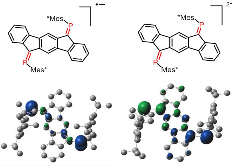 王新平课题组近几年在磷自由基化学领域取得了一系列研究成果。2013-2015年利用弱配位阴离子,课题组合成了具有平面结构的三芳基磷自由基阳离子、含有P-P π键的四芳基双磷阳离子以及两例电子自旋密度分布完全相反的磷四元环自由基阳离子(JACS 2013,135, 3414; JACS 2013,135, 5561; JACS 2014,136, 6251;Dalton Trans. 2015, 44,15099)。 2014年课题组利用大位阻配体得到了稳定的基于P-C双键的的单磷自由基阴离子(JACS 2014,136,9834)。在此基础上, 课题组近来通过扩大π共轭效应,并结合空间位阻效应,构建了一例由双P=C为骨架的化合物,通过连续还原,得到了双磷自由基阴离子。光谱分析、单晶结构测试以及理论计算验证了化合物具有(双)自由基性质。该结果表明通过对中间芳香环的扩展,有可能合成得到以多磷为中心的链状寡聚物及聚合物自由基,且可能具有导电或发光等性能。