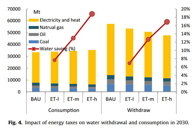该研究基于全国动态递归的CGE(Computable General Equilibrium)模型,分析了能源政策对水资源以及节水政策对能源的潜在影响。研究发现:能源税政策的实施将会抑制化石能源的生产和消费,促进可再生能源的发展,优化能源结构。能源税政策还有着显著的水资源节约效应,为实现水资源管理的“三条红线”目标提供较大的贡献。该研究为水和能源的协同管理提供基础,可为平衡环境保护和水资源节约的政策设计提供更加深入的视角。