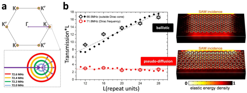 图-2 (a)在蜂窝晶格的布里渊区顶点位置,表面声子发生能量简并,并具有满足狄拉克方程描述的线性色散关系。(b)在71.8兆赫兹的狄拉克频率,材料中的声表面波显现出类似在完全无序介质中的“扩散”情形(红色);这一情形随着狄拉克频率的远离而逐渐消失(黑色)。