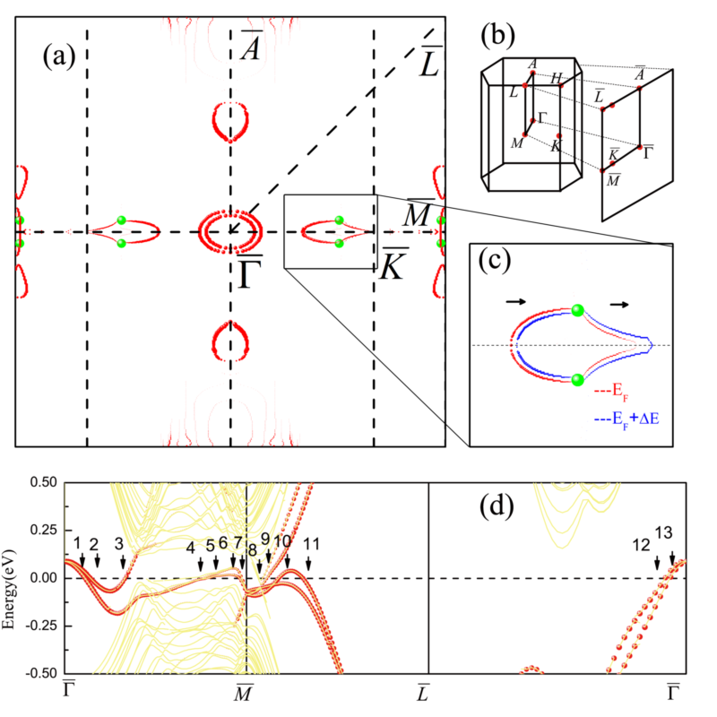 图3 理论计算TaAs高压相(100)方向的表面态及费米弧。