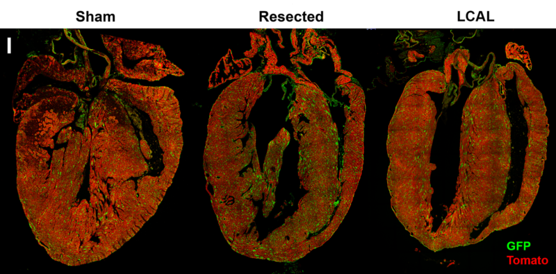 上图显示对照(Sham)与心肌损伤后修复心肌组织中p53阳性细胞(绿色)的分布。心肌损伤模型:Resected, 心尖切除模型; LCAL, 心脏左前降支结扎模型。
