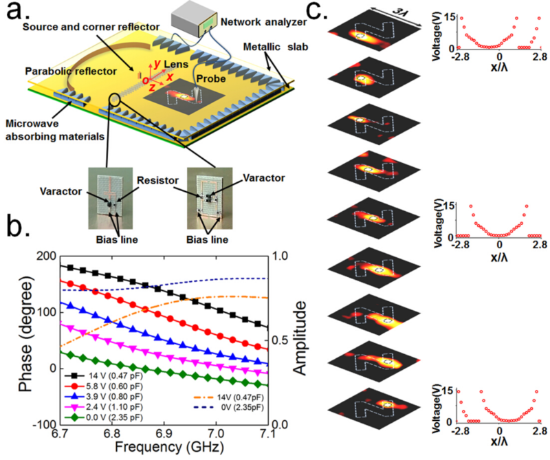 该工作将微波变容管耦合到超表面单元的结构中,通过事先设定的程序可以独立、连续控制每个单元的电磁响应,从而实现了微波信号在任意焦点位置聚焦、任意多焦点聚焦及动态焦点的快速扫描等功能,如图2所示。所设计和制备的超透镜集亚波长厚度、接近衍射极限的焦斑、高透射效率、实时连续可重构性、任意程序控制和快速响应等优势于一身,有望使超表面和超透镜技术在实时、快速和复杂电磁波调控上得到应用,并为诸如动态全息成像和聚焦、波束整形和扫描、可调天线辐射等方面的实际应用奠定良好的基础,其设计概念和方法还可进一步拓展到太赫兹、红外和可见光领域,实现小型、高效的光学镜片和动态成像系统,应用前景广阔。