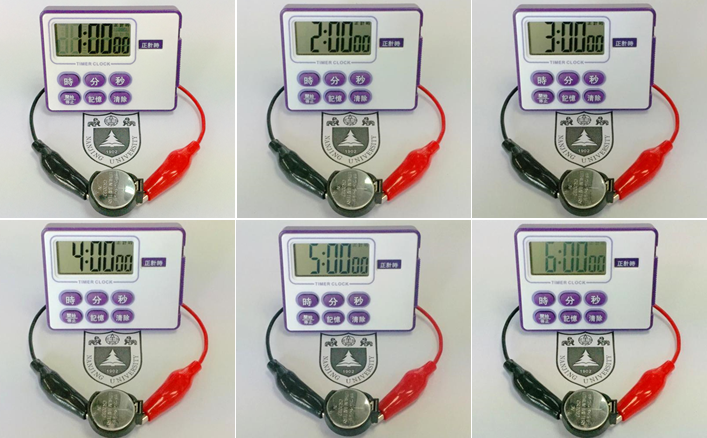 图2. 离子液体电解液中3DG基超级电容器驱动计时器工作展示。
