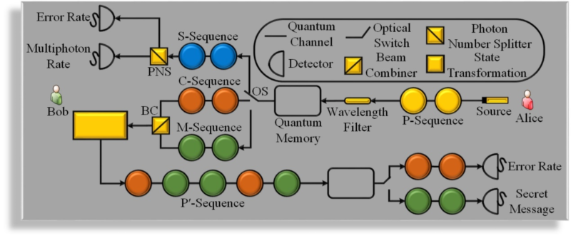 为解决量子密钥分发低效问题,2000年量子直接通信(Quantum Direct Communication)被提出。和量子密钥分发不同,量子直接通信可直接将信息编码到量子态中进行通信,它无需在通信双方分发密钥,避免了光子被浪费的问题,因此近年来受到广泛关注。研究团队基于成组传输和光子重排技术,使用高维单光子作为信息载体,提出一种确定性安全量子通信(Deterministic Secure Quantum Communication)协议。其中成组传输和光子重排技术保证了信号前向和后向传输的安全性。使用高维量子系统使协议实现了更高的安全检测效率和信息传输效率。