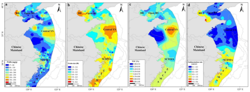 图 2 中国东部海域表层沉积物PAHs浓度(a), 粒度(b), 有机碳含量(c)和沉积速率(d)分布图