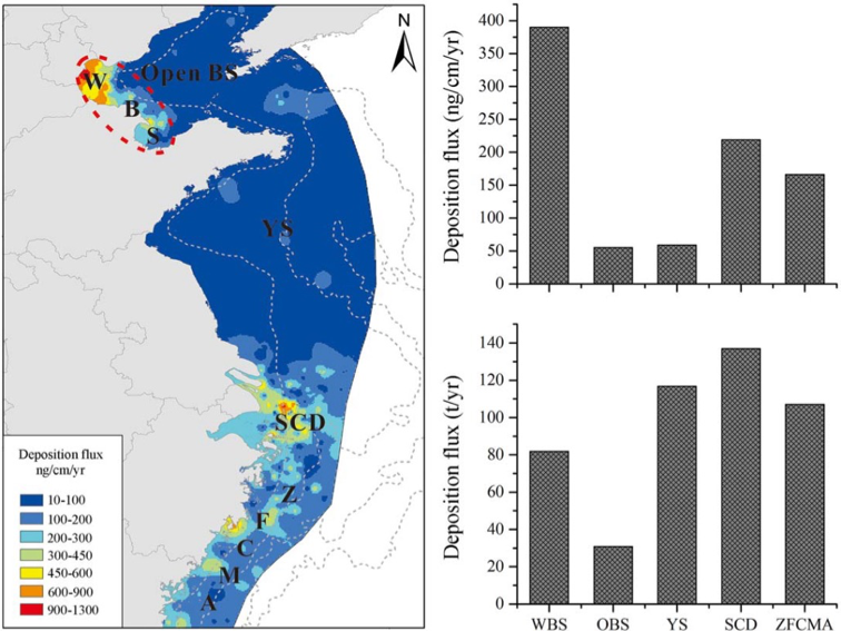 本研究是对该领域前期成果的进一步深化,以我国东部陆架海域表层沉积物中PAHs浓度数据为基础,结合研究区沉积物粒度、有机碳含量以及区域海洋动力条件等资料(图2),首次获取了整个中国东部海域表层沉积物中PAHs的分布模式,并探究了其可能的影响因素。此外,本研究以沉积过程为基础,估算了研究区PAHs的年沉降通量,并进一步结合物质守恒原理建立了研究区PAHs的收支平衡。研究结果表明,研究区PAHs分布特征主要受区域动力条件以及沉积物理化特性(粒度、有机碳含量、沉积速率等)的影响,PAHs高值区主要分布在泥质沉积区;源解析结果显示研究区多环芳烃的来源具有明显的空间差异,这与我国南北社会经济结构的差异有关(图3);研究区PAHs的埋藏通量处于11.2-1308 ng cm-2 yr-1,平均埋藏通量约为101±104 ng cm-2 yr-1,研究区范围内的年埋藏通量约为494 t;收支平衡研究表明(图4),PAHs主要来源于河流径流和大气沉降,分别贡献了PAHs总入海通量的28.4%和71.6%,每年约有10.2 t的PAHs通过水流交换由渤海输入到黄海海域;此外,在东海陆架跨陆架输运的作用下,约有21%左右的入海PAHs被输送到外陆架区域。该项研究全面深入的探讨了我国东部陆架海域表层沉积物中PAHs的分布模式和收支平衡,可以为边缘海PAHs的环境行为提供研究范例,也可为我国近海PAHs污染防治以及生态系统健康评价提供决策参考和理论支撑。