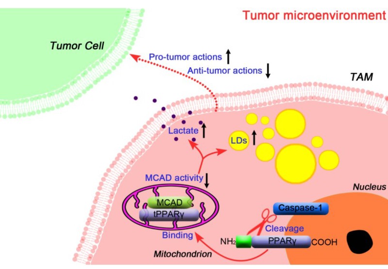 课题组研究人员首先在人和动物的肿瘤组织中分离得到一类呈现脂滴积累与高乳酸分泌表型的巨噬细胞。通过功能分析证实该类细胞可显著促进肿瘤的生长,是典型的TAM。研究者发现,这类TAM的形成受caspase-1/PPARγ分子轴的控制。其过程为:肿瘤微环境诱导巨噬细胞caspase-1活化、切割PPARγ分子并产生41 kDa的PPARγ片段,该片段结合线粒体中链脂酰辅酶A脱氢酶(MCAD)并抑制其酶活性。由于MCAD是催化细胞线粒体脂肪酸b氧化起始步骤的关键酶之一,其活性降低直接导致了巨噬细胞内脂肪酸分解代谢偏移及脂滴积累。研究人员证实:正是由于这一代谢特征的改变,导致了巨噬细胞免疫行为的剧烈变化,使其成为肿瘤发展的促进者。根据这一发现,研究人员设计使用了caspase-1小分子抑制剂,结果发现该抑制剂可明显抑制TAM脂滴、MCAD活性,可明显抑制TAM的促肿瘤效应及肿瘤的生长。