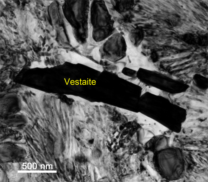 灶神星(Vesta)是太阳系主小行星带第四颗小行星;最近几年美国的黎明号飞船对灶神星进行了探测,掀起了一股灶神星研究热潮。近五年,张爱铖教授课题组投入大量精力来研究灶神星陨石,已经取得了一系列丰硕的成果。去年,庞润连在一块灶神星陨石中观察到了5种高压矿物相(其中3种是第一次在灶神星陨石中报道),为限定形成灶神星陨石的撞击坑大小和强度提供了重要制约。在该研究的基础上,庞润连在该陨石中发生撞击熔融的区域发现了一种很小(< 3 ?m)但高度富钛的氧化物矿物(ti4+Fe2+)Ti4+3O9。借赴德国耶拿大学联合培养的机会,庞润连和同事使用先进的透射电镜分析技术鉴定出这个氧化物应该是一个新矿物。今年7月份,张爱铖教授课题组向国际矿物学会提出申请,认为这是一个新的富钛的氧化物矿物,并将该新矿物根据其母体小行星命名为Vestaite—灶神星矿。国际矿物学会新矿物命名与分类委员会花费两个多月的时间,经20位专家评委投票表决通过了新矿物申请和命名。Vestaite是灶神星陨石中发现的第一个新矿物,它的发现不仅对认识灶神星陨石的冲击变质强度和历史有重要意义,对认识地球深部物质组成也有重要的价值。
