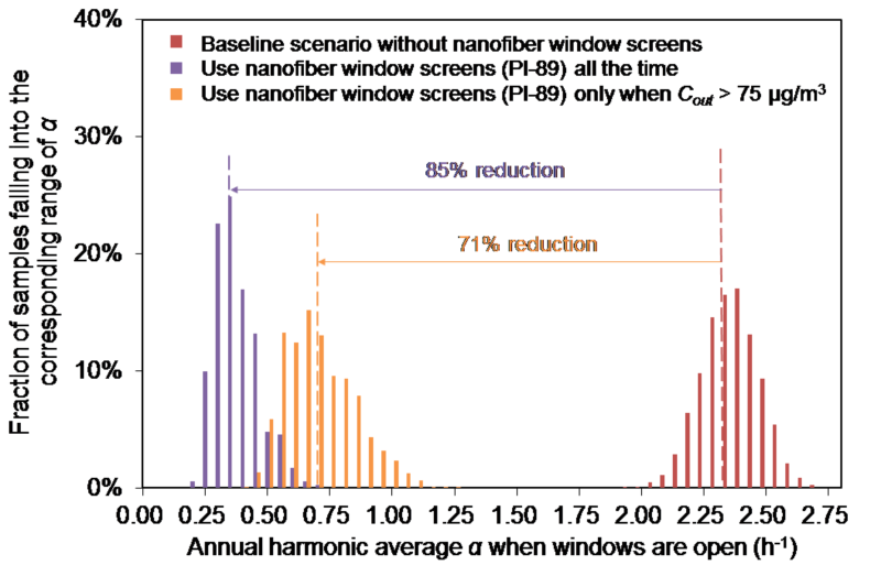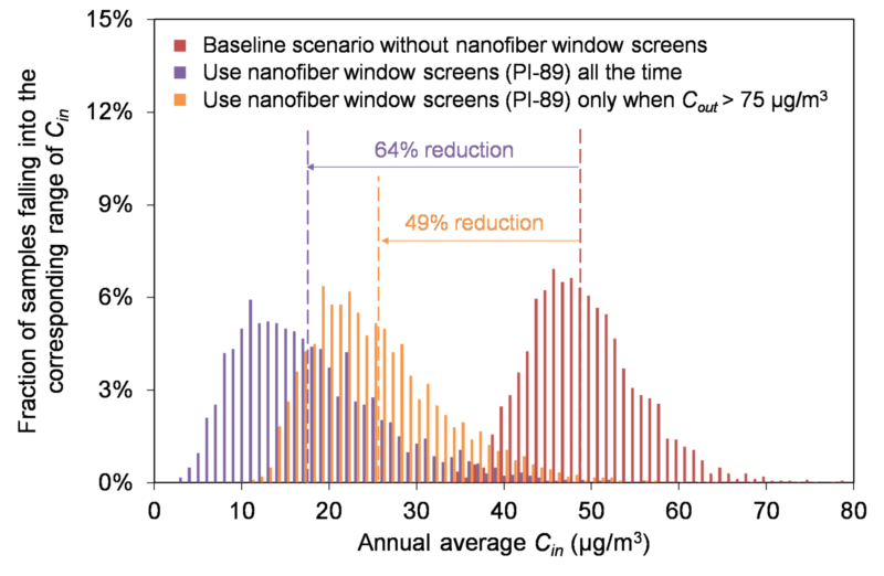 该研究基于颗粒物动力学特性及建筑通风理论建立模型,评估实验室制备纳米纤维薄膜在实际应用中对建筑室内PM2.5浓度及建筑通风的影响。通过对三种新近发展的纳米纤维薄膜纱窗在北京市住宅中实际应用效果的评估可以发现,使用纳米纤维薄膜纱窗可以有效降低室外PM污染对室内环境的影响,室内PM2.5浓度年均值可下降64%-66%。同时,纳米纤维薄膜纱窗的使用也使得建筑自然通风换气次数显著降低。全时段使用纳米纤维薄膜纱窗可导致平均自然通风换气次数下降85%到88%;仅在室外PM2.5浓度超标时使用纳米纤维薄膜纱窗可减小其对建筑通风的影响,但其所对应的平均自然通风换气次数仍无法达到国家标准。