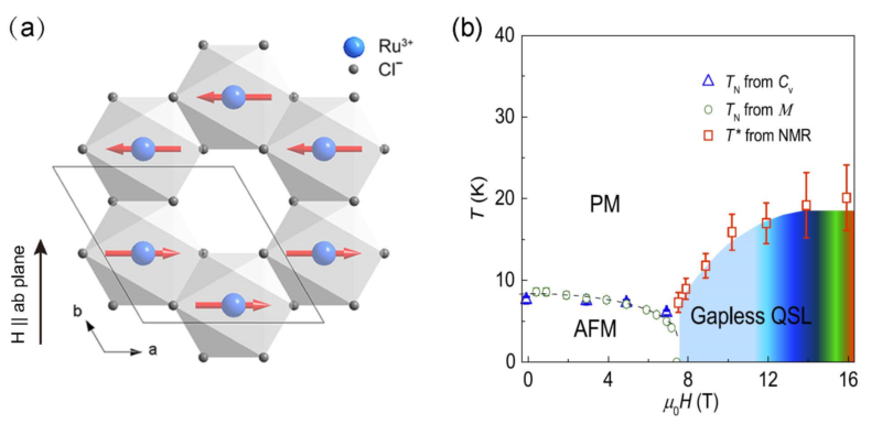 图1. (a), α-RuCl3的晶体结构。 (b),磁场与转变温度相图。相图左侧的温度为通过比热与磁化率测量获得的反铁磁转变温度,右侧为通过核磁共振获得的晶格-自旋弛豫率的转变温度。