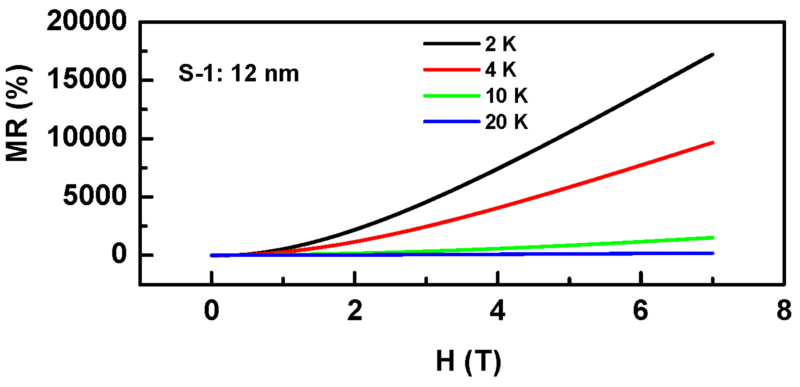 凯发k8官网微结构科学与技术协同创新中心、凯发k8官网固体微结构物理国家重点实验室和现代工程与应用科学学院材料科学与工程系的张善涛教授和周健副教授通过合作,在双钙钛矿亚铁磁性氧化物Sr2CrWO6半金属(half-metal)薄膜中,实现了巨正磁电阻效应。该工作通过脉冲激光沉积法,制备了一系列高质量的Sr2CrWO6薄膜。这些薄膜在低温下表现出厚度依赖的巨正磁电阻效应,厚度越薄,正磁电阻效应越大。其中12纳米厚的薄膜,在2 K和7 Tesla的条件下,正磁电阻达到17200% (图1)。本工作提出了两种可能的物理机制:其一是外加磁场破坏Sr2CrWO6半金属薄膜中的亚铁磁长程有序,导致畴界的增加,而增加的畴界会导致电阻的增大;其二是高质量Sr2CrWO6半金属薄膜中的高载流子迁移率可能对巨正磁电阻有贡献。