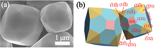 图1 BiVO4三十面体;(a)电子显微镜照片,(b)对应的模型图。