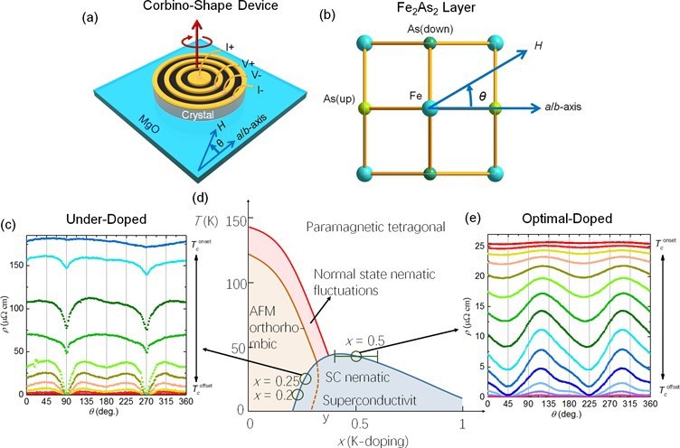 图1. (a) 圆形电极(Corbino)铁基超导测试器件结构示意图。(b)122相铁基超导面内晶格结构和磁场旋转方向。(c)欠掺杂Ba0.75K0.25Fe2As2样品面内各向异性磁阻和磁场旋转角度的关系。图中测量温度为超导转变区域,即从Tc-onset到Tc-offset。(d) 空穴型122相铁基超导体相图,图中x为K的掺杂浓度(Ba1-xKxFe2As2)。(e)最佳掺杂Ba0.5K0.5Fe2As2样品面内各向异性磁阻和磁场旋转角度的关系。图中测量温度也为超导转变区域。