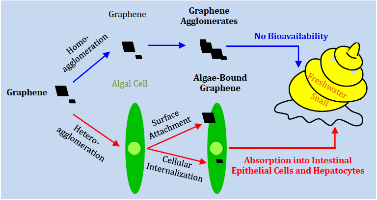 图2. 石墨烯与绿藻相互作用对螺丝摄入石墨烯的影响示意图