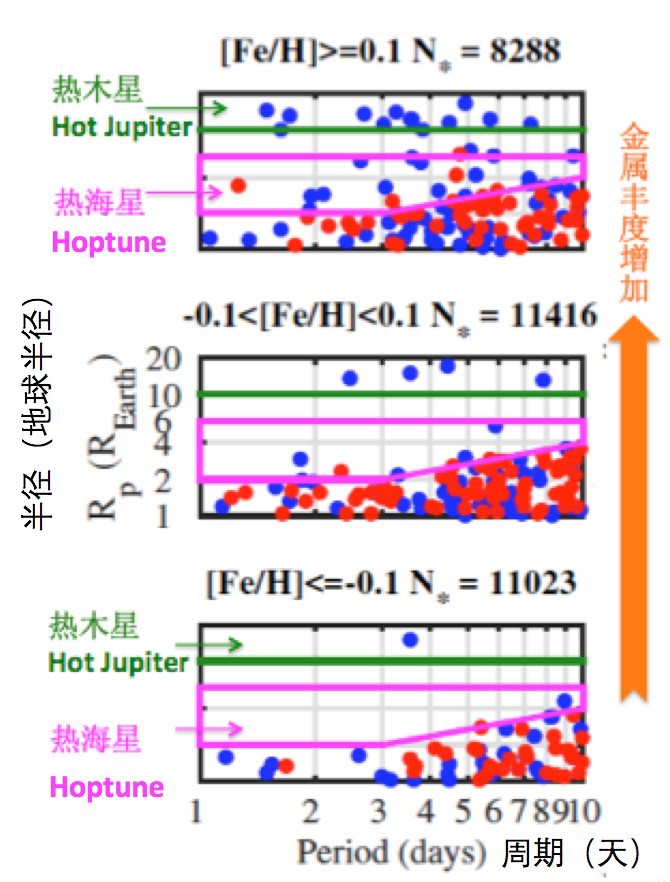 图3: 热海星的发现。不同金属丰度([Fe/H])下的行星轨道周期(Period)和行星半径(RP)的分布。从下至上,金属丰度增加。蓝色的点表示单凌星系统(系统中只发现这颗行星),红色的是多凌星系统。热木星的区域是在绿色横线的上端。粉色线段围成的就是热海星区域。LAMOST观测提供精确的宿主恒星半径和金属丰度。恒星半径进而用于确定行星的半径(开普勒卫星测光观测只能给出行星和恒星的半径比)。