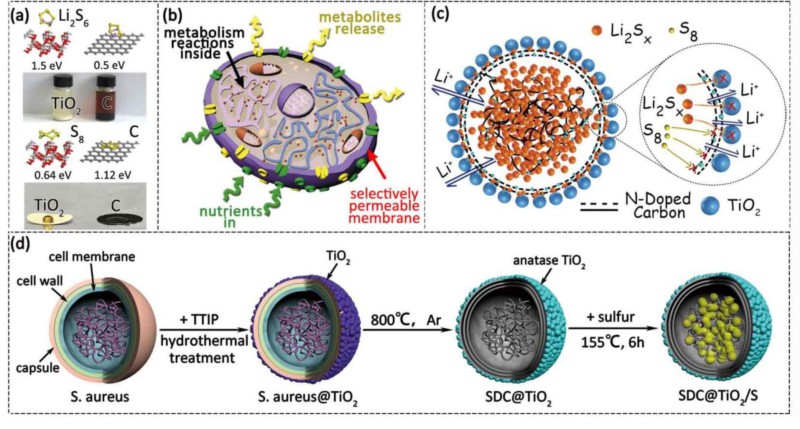 (a)TiO2与碳的极性研究,图中计算和实验显示TiO2与多硫化物,非极性碳与S8作用较强,反之则作用较弱;(b)仿生思路:生物细胞膜的选择性透过膜控制营养物质和代谢产物进出。(c)“仿生”双极性正极结构。内部非极性吸附支撑硫,外壳层限制多硫化物;(d)以金色葡萄球菌为初始结构的硫正极材料制备过程