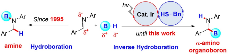 亚胺的硼氢化反应是有机合成实验室中最常用制备胺的手段之一。由于高度极化的硼氢键,使得硼烷中的氢原子总是优先加成到亚胺的碳端。a-氨基硼类化合物是一类非常重要的合成中间体,而传统的合成策略却难以实现复杂分子的后期修饰。我院分子与材料合成研究团队成员经过仔细分析,首次提出了亚胺的极反转硼氢化新概念。通过可见光与硫醇有机小分子的协同催化,在温和条件下从NHC-BH3直接产生硼烷自由基,巧妙实现亚胺的反区域选择性硼氢化。为了最大限度抑制竞争的硼氢化进程,结合理论计算筛选出苄基硫醇为最优有机催化剂。重要的是,该合成技术可以成功应用到复杂生物分子的后期硼修饰中,弥补以往策略的局限性。该项工作为a-氨基硼类化合物的简便构建提供了一种全新的思路,得到审稿人的高度好评,其中一位匿名评审人评价到“This is a great addition to the arsenal of reactions that NHC-boryl radicals can achieve.”